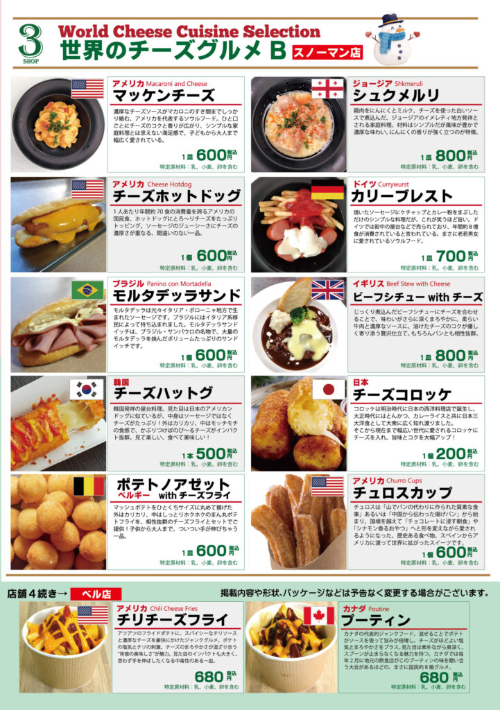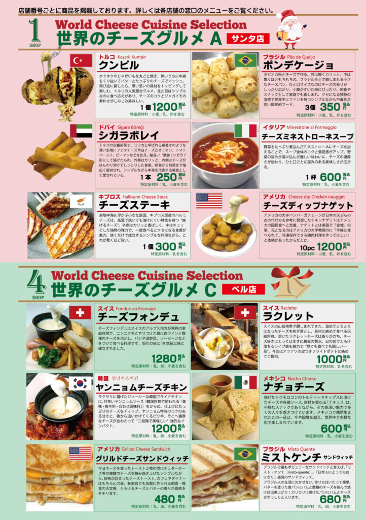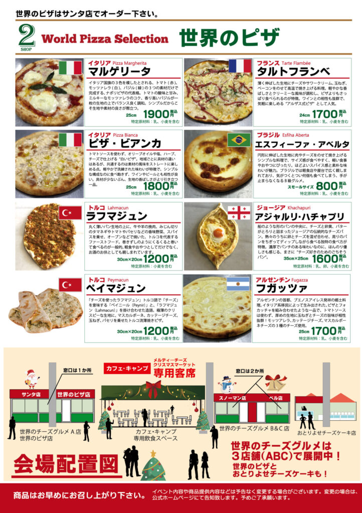 ・ブース1 世界のチーズグルメA サンタ店・ブース2 世界のピザ店 カフェキャンプ(客席)・ブース3 世界のチーズグルメB スノーマン店・ブース4 世界のチーズグルメC ベル店・ブース5 おとりよせチーズケーキ店