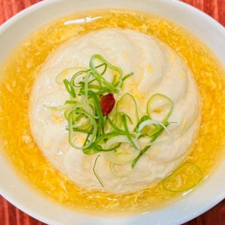 優しい味わいの、かき玉中華スープに浮かんだジャンボ豚まんを崩しながらスープとともにお召し上がりください。